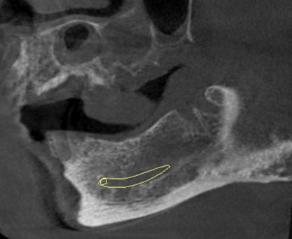 Sagittal image showing loss of lamina dura i.r.t the distal root of 36. Bulbous apical 3rd region noted with the distal root of 36.