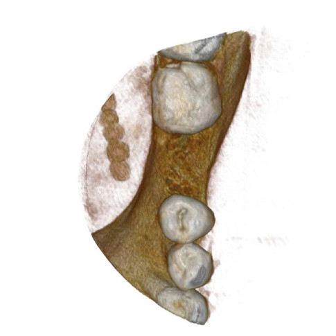 Left submandibular duct (Wharton's duct) sialolith chain : 3d images and axial sections at 90µm showing localized, well demarcated, confluent, globular radiodensities within the lingual tissues corresponding to the medial aspect of 35-37 region. The masses show a concentric pattern.