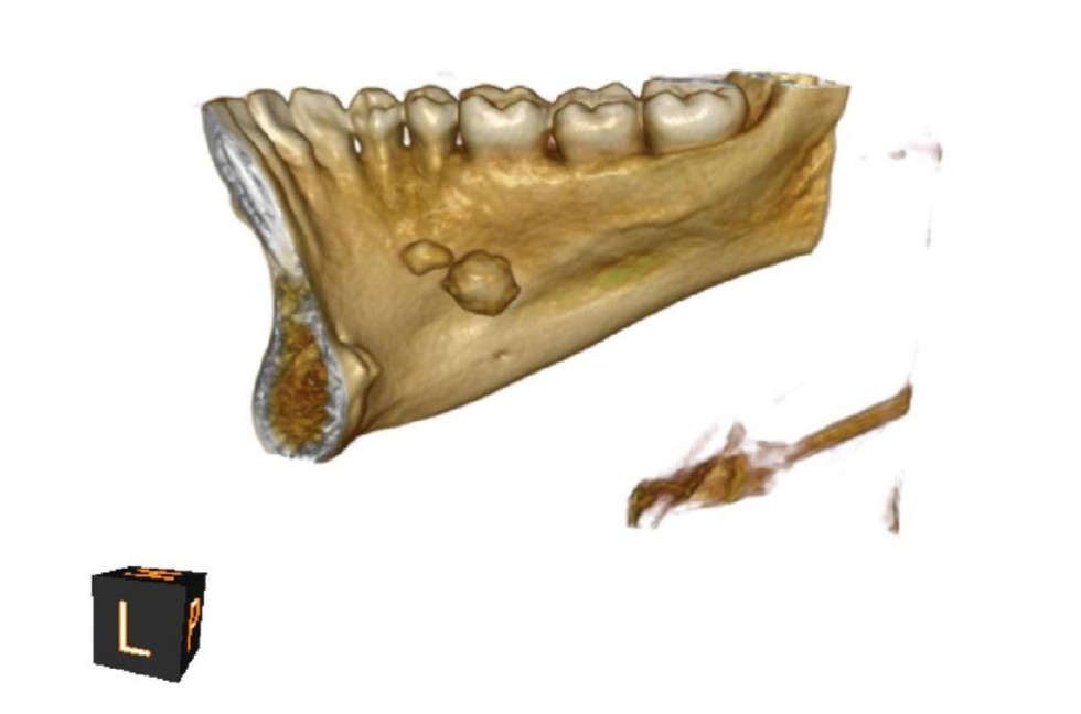 Left submandibular duct sialolith at the distal portion. Axial sections at 180µm show a localized, well defined, radiopaque mass within the lingual soft tissues corresponding to 31-33 region. The mass is located at approximately at the level of the lingual crestal region.